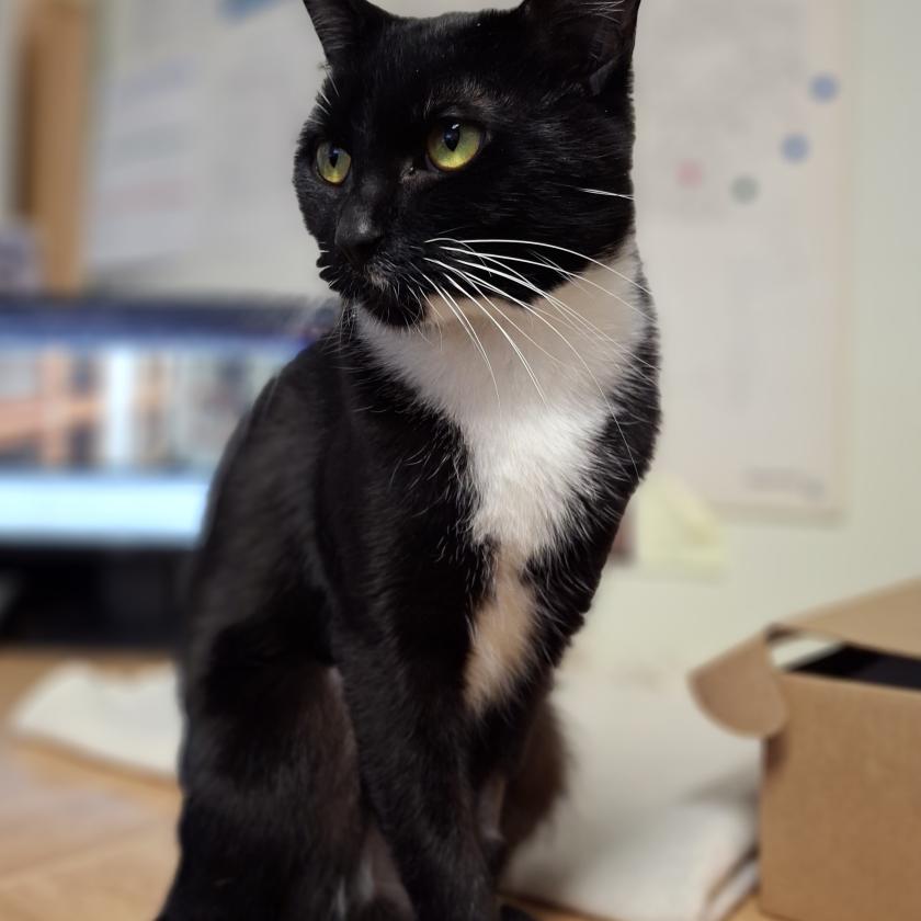 Blanche is full of surprises. She is timid when first meeting people, or interacting with new environments, but once she comes around she is a snuggly, drooly, playful, and chatty young lady. She loves to chase after ping pong balls, sprawl tummy up across a warm lap, or politely chat about her day as she follows people around.