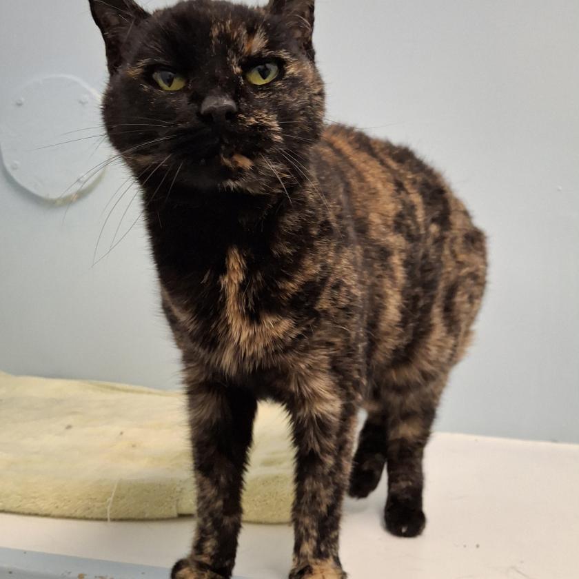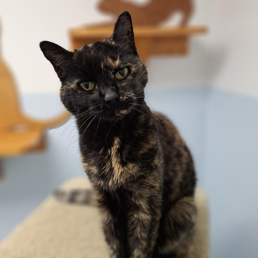 This beautiful lady is Elizabeth. She is a charming, content, and relaxed senior torti who loves to chat with her people and share their snacks. She loves to lounge on her cat post or sprawl across a cool floor. She will seek out affection in short bursts, be she is most happy sitting near her people without actually touching them.