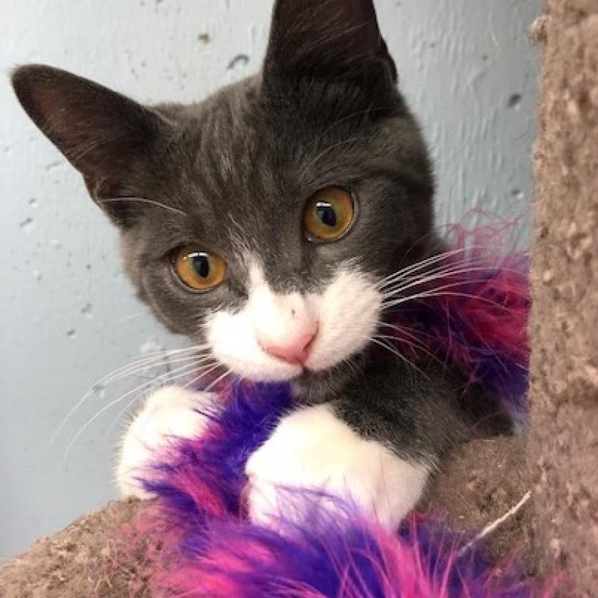 Neutered male kitten about 4 months old. Freddy is very active and energetic. He will need lots of daily play time. He will knock things over and climb everything. After he has tired himself out he loves to snuggle.