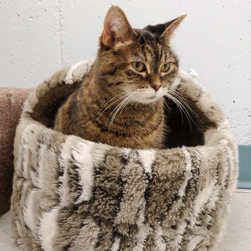 Malibu came to us after her owner passed away. At first she was very depressed and didn’t have much drive to do anything. But thankfully after some adjustment time she is becoming more social and confident with each day. She has had a couple of accidents outside of her litter box during her adjustment to being here with us, but this will most likely stop when she is more comfortable and in a home environment. Malibu previously lived with two large dogs (Duke & Ruby who are also available for adoption) and is very comfortable and confident around them, however have not seen her interact with another cat while at the pound.