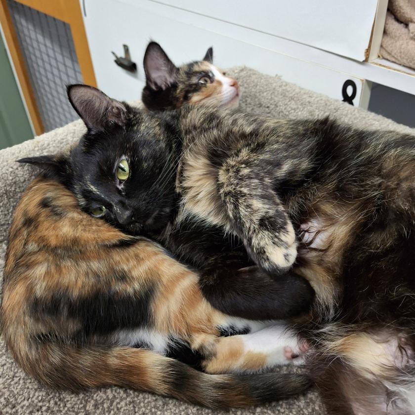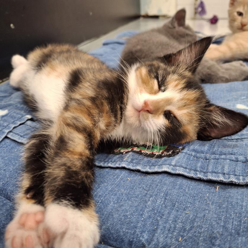 Nadja (female calico) is an easy going young lady. She loves to follow her mama around and learn about the world around her. She enjoys snuggling with her siblings and chasing ping pong balls. Nadja would be a great pair with Akasha.