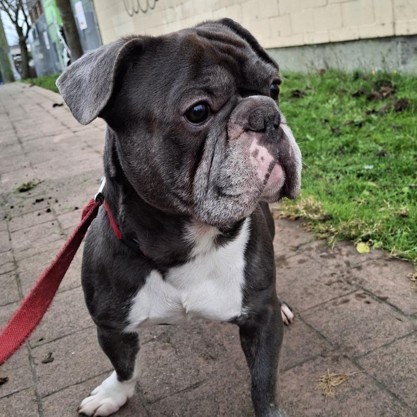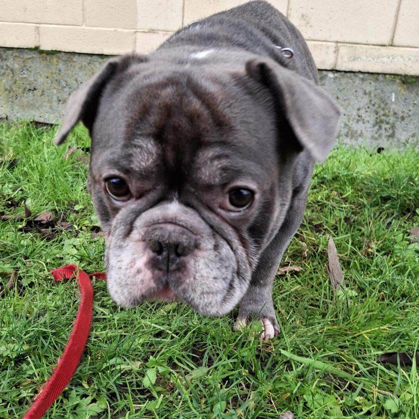 We believe Stuart is a Frug (a French Bulldog/Pug mix). He is approx. 5 years old and weighs about 45lbs. We have not seen him interact with cats. Stuart was recently neutered and we are hoping this stops his excessive marking.